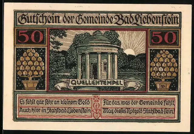 Notgeld Bad Liebenstein, 50 Pf, Quellentempel und Ortsansicht, Besserung Herz und Nerven, mit Seriennummer