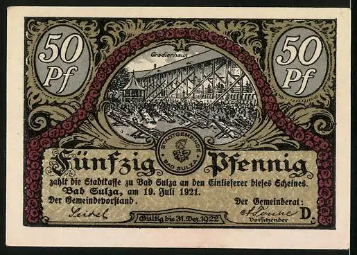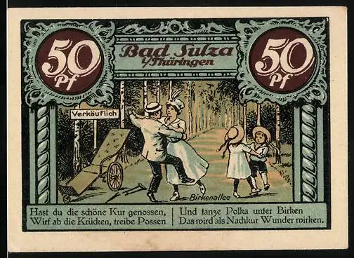 Notgeld Bad Sulza 1921, 50 Pfennig, Tanzendes Paar in der Birkenallee, Gradierhaus