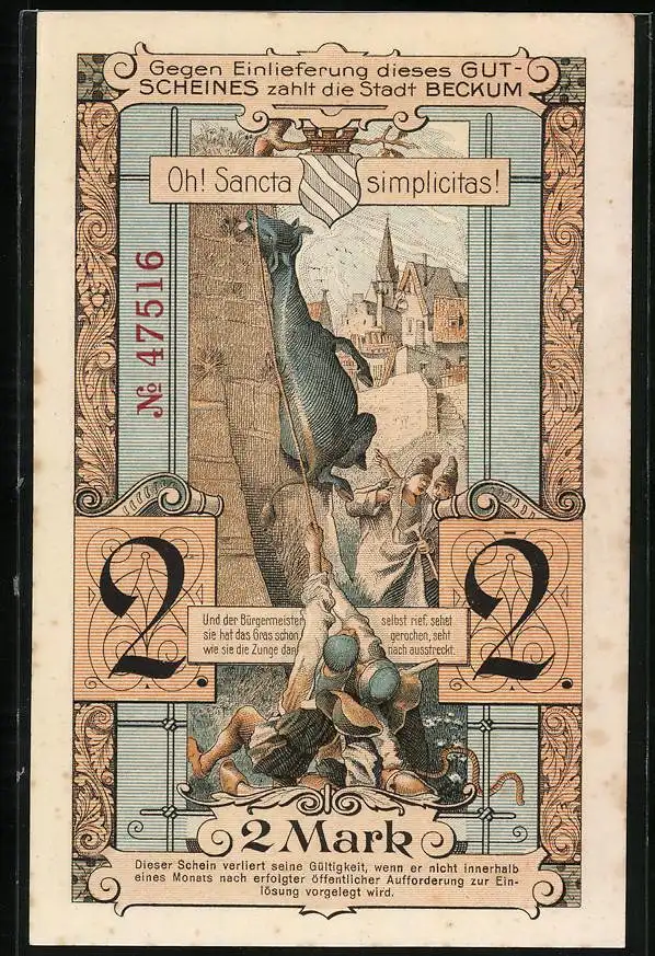 Notgeld Beckum 1918, 2 Mark, Motiv mit Stadtansicht und Oh! Sancta simplicitas!