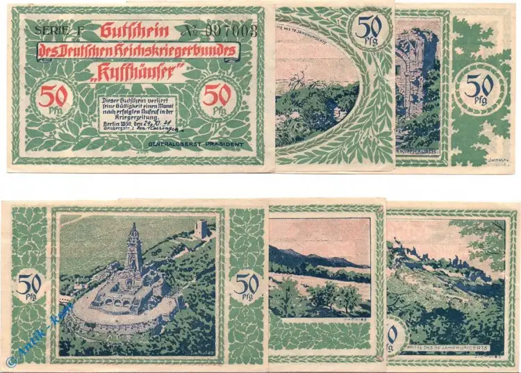 Der Notgeldsatz besteht aus : 6 x 50 Pfennig , 6 x gleiche Kennummer