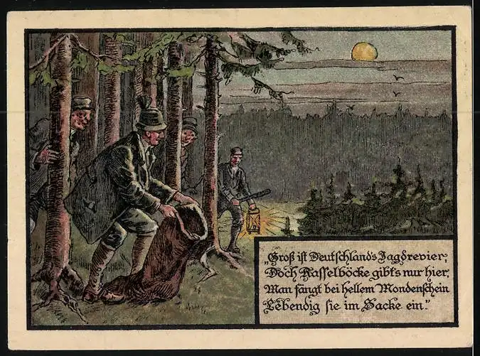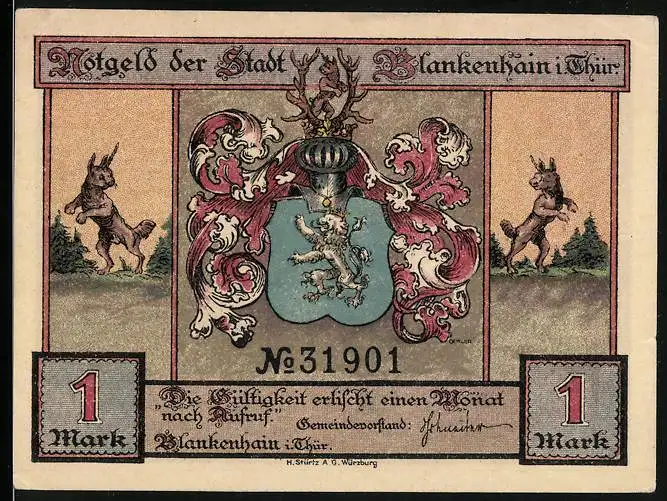 Notgeld Blankenhain i. Thür., 1 Mark, Jäger im Jagdrevier jagen Rasselböcke, Wappen
