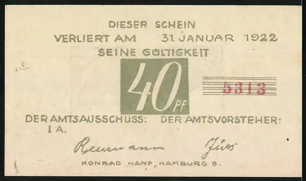 Notgeld Brande-Hörnerkirchen, 1922, 40 Pf, Marktplatz-Motiv, Gültigkeit bis 31. Januar 1922, Seriennummer 5313
