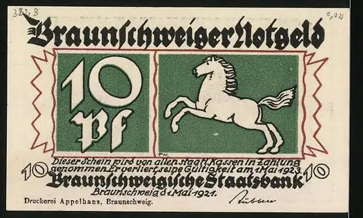 Notgeld Braunschweig 1921, 10 Pfennig, Ansicht von Braunschweig mit Text und Pferd