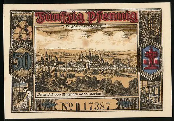 Notgeld Butzbach 1921, 50 Pfennig, Ansicht nach Merian, Landgraf Phillipp