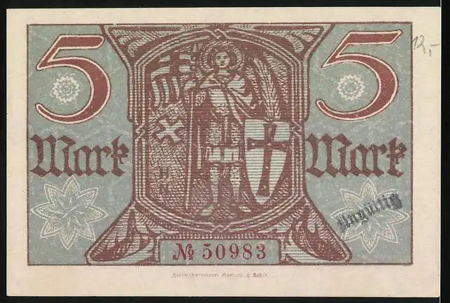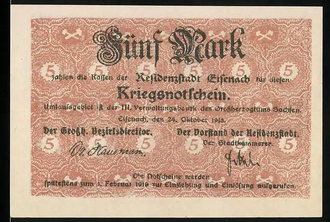 Notgeld Eisenach, 1918, 5 Mark, Kriegsnotgeldschein mit Stadtwappen und Seriennummer 50983