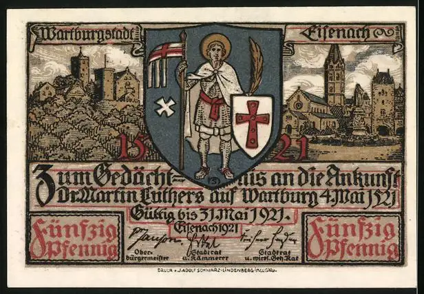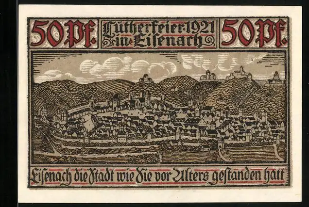 Notgeld Eisenach 1921, 50 Pfennig, Ansicht der Stadt, Kreuzritter auf Wappen