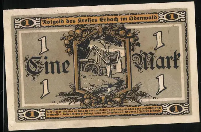 Notgeld Erbach i. Odw. 1918, 1 Mark, Mühle, Bäuerin mit Getreide