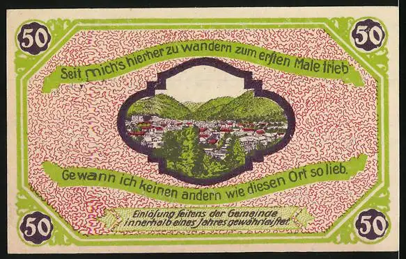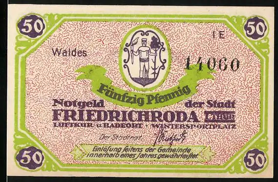 Notgeld Friedrichroda, 1921, 50 Pfennig, Stadtansicht mit Wäldern und Stadtwappen, Seriennummer 14080