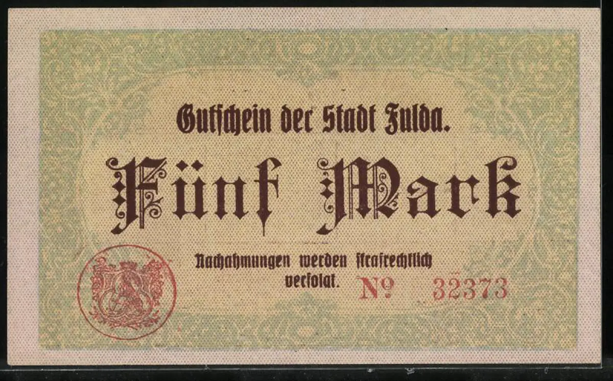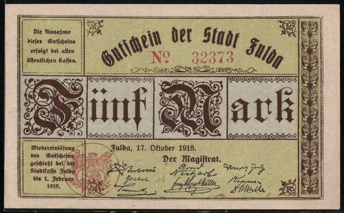 Notgeld Fulda 1918, 5 Mark, gotische Schrift mit Wappen und Magistratsunterschriften