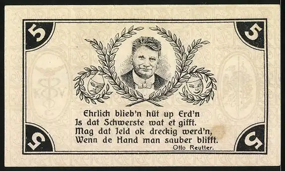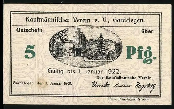 Notgeld Gardelegen 1921, 5 Pfennig, Kaufmännischer Verein mit Stadtansicht und Otto Reutter Zitat