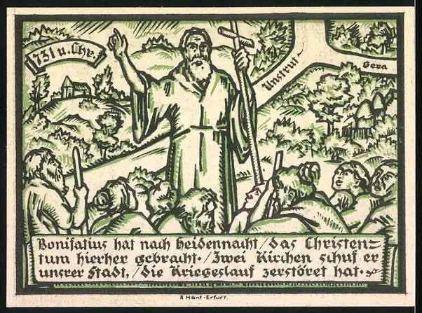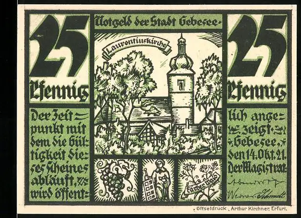 Notgeld Gebesee 1921, 25 Pfennig, Laurentiuskirche und Bonifatius bringt das Christentum