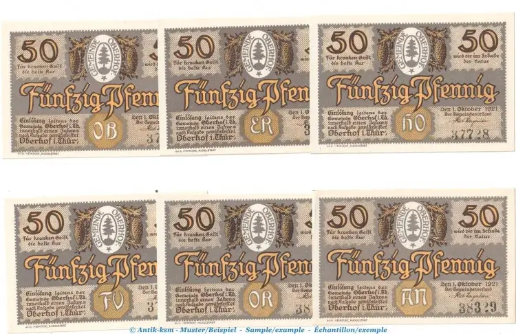 Notgeld Gemeinde Oberhof 996.4 , Set mit 6 Scheinen 50 Pf. in kfr. von 1921 , Thüringen Seriennotgeld