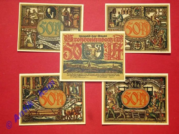 Der Notgeldsatz besteht aus : 5 x 50 Pfennig