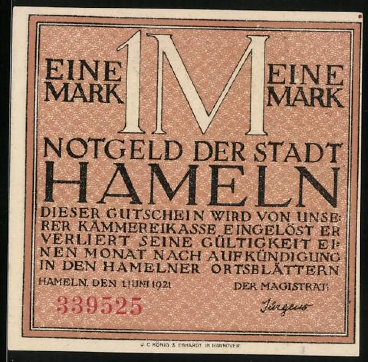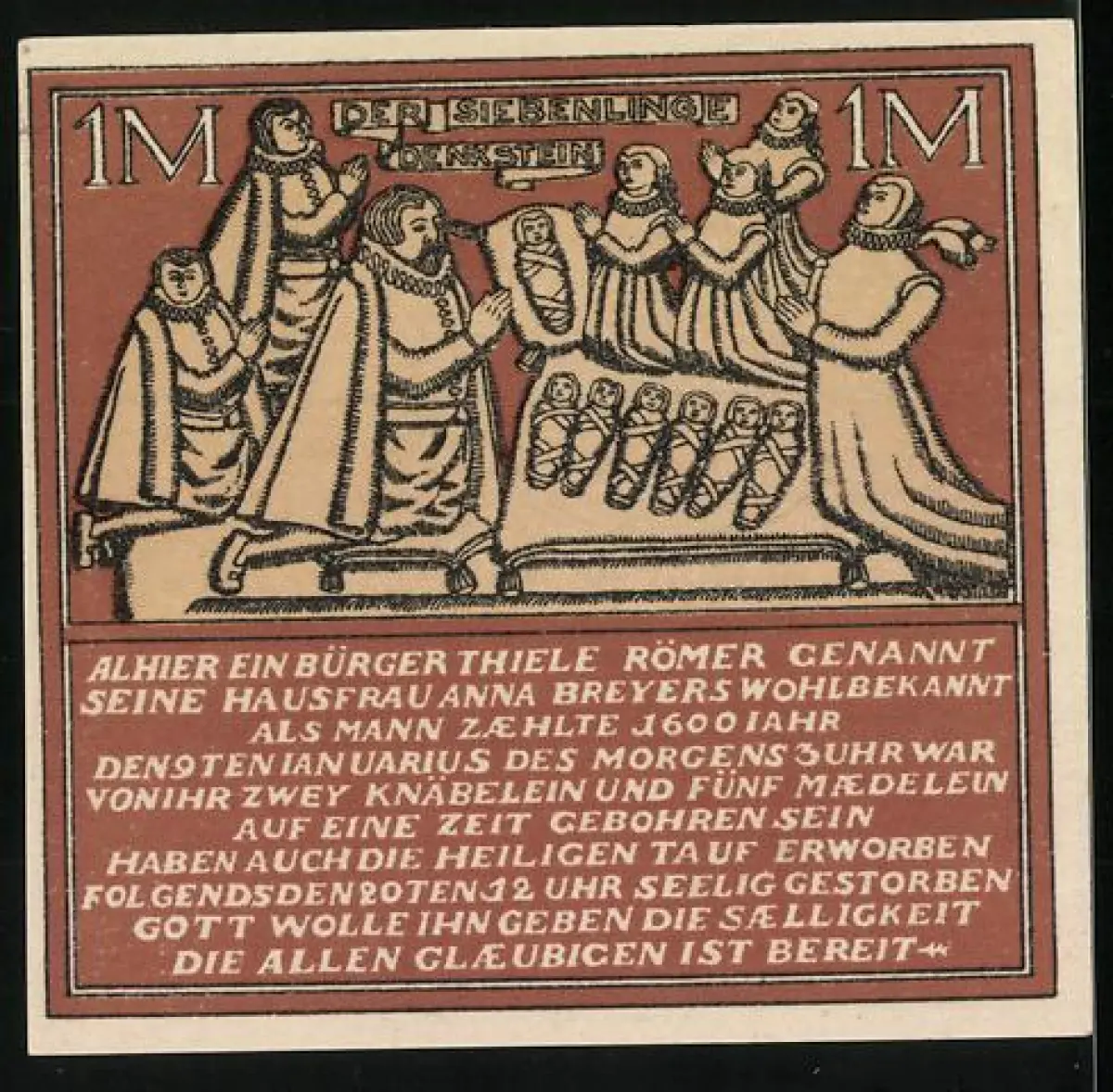 Notgeld Hameln 1921, 1 Mark, Motiv der Siebenlinge von 1600, Seriennummer 339525