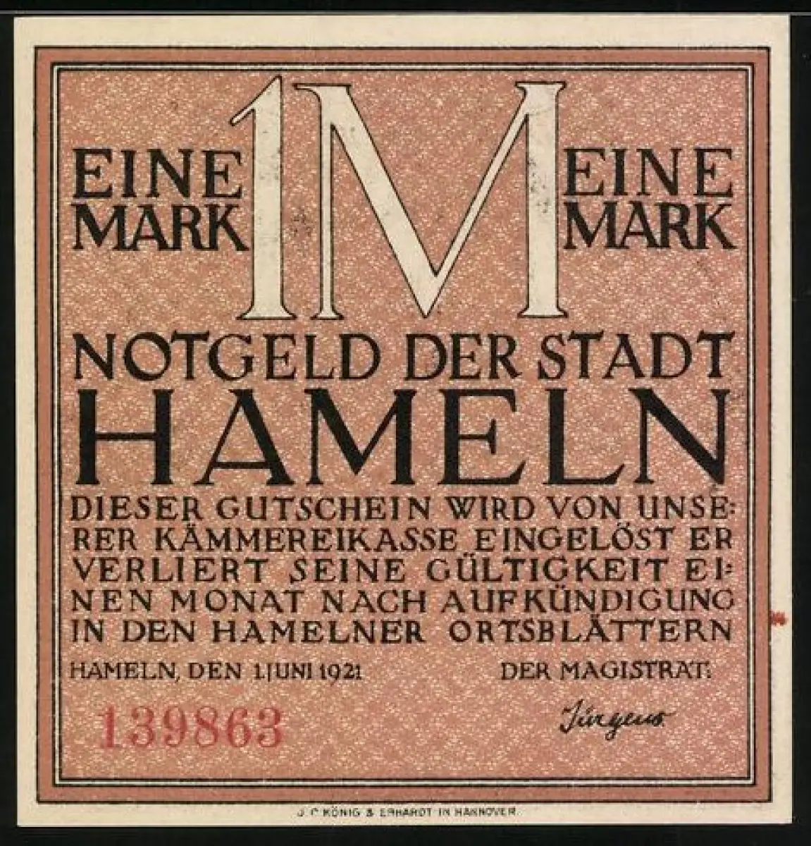 Notgeld Hameln 1921, 1 Mark, Siebenlinge-Motiv mit historischem Text