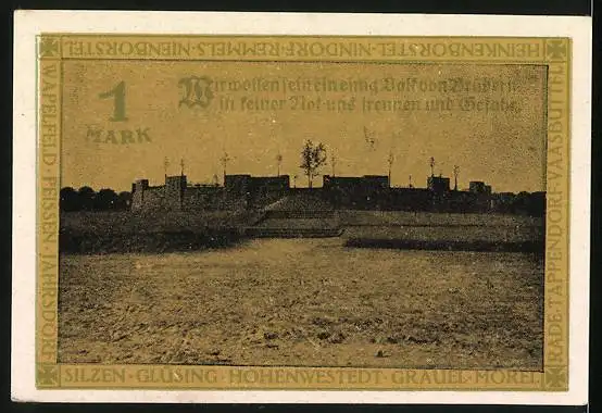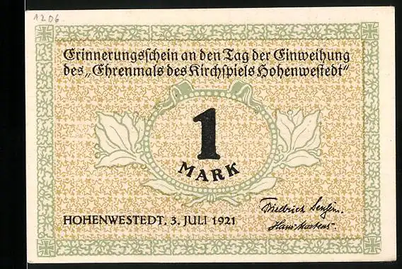 Notgeld Hohenwestedt 1921, 1 Mark, Erinnerungsschein an Einweihung des Ehrenmals des Kirchspiels Hohenwestedt