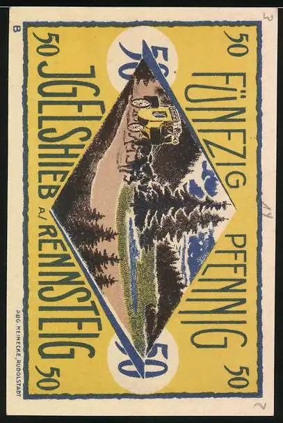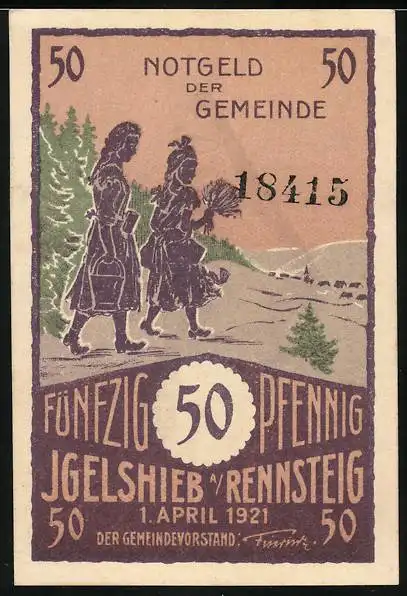 Notgeld Igelshieb am Rennsteig, 1921, 50 Pfennig, zwei Frauen auf Wanderung, gelber Rahmen mit Landschaft und Kutsche