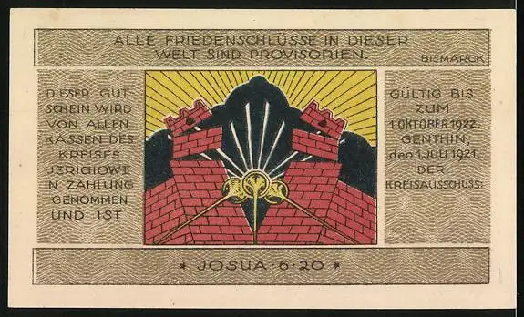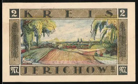 Notgeld Jerichow, 1921, 2 Mark, Landschaft und Stadtansicht, Burgmauer mit Trompeten