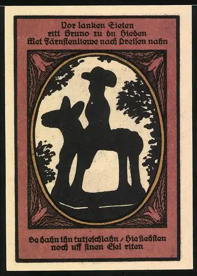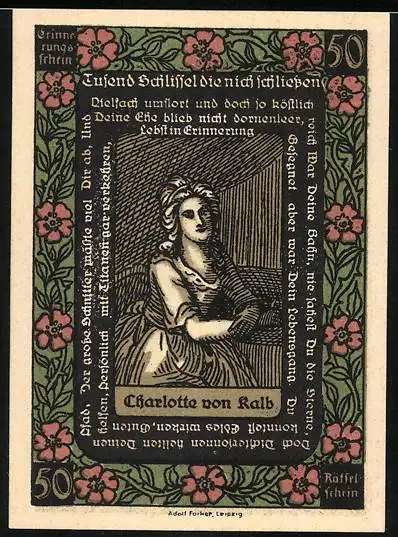 Notgeld Kalbsrieth, 50 Pfennig, Charlotte von Kalb Porträt mit Gedicht und Reiter auf Esel in Silhouette