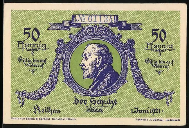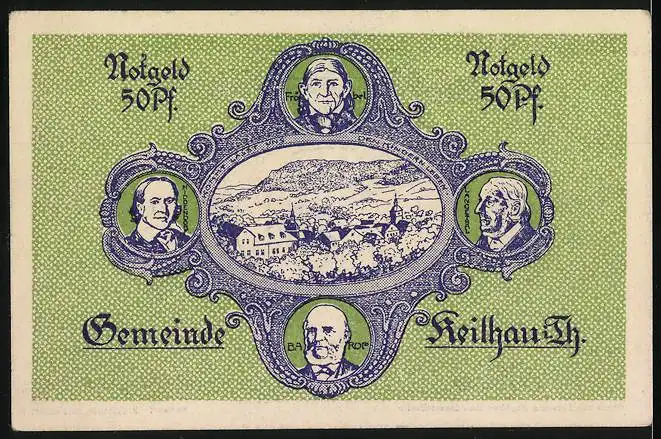 Notgeld Keilhau 1921, 50 Pfennig, Porträt eines Mannes und Ortsansicht mit vier Porträts