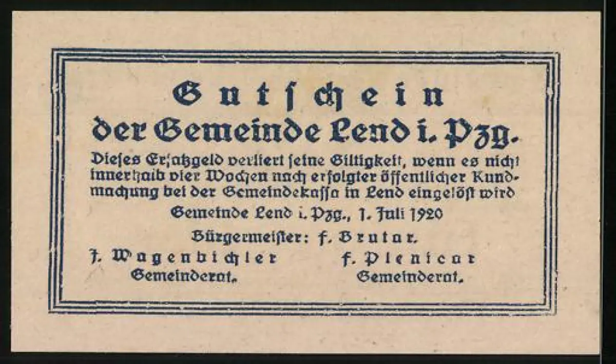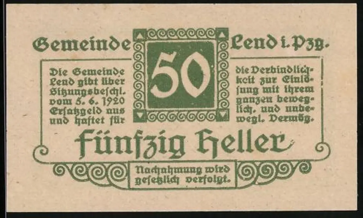 Notgeld Lend 1920, 50 Heller, Textgestaltung mit Gemeindehinweis und Ornamenten