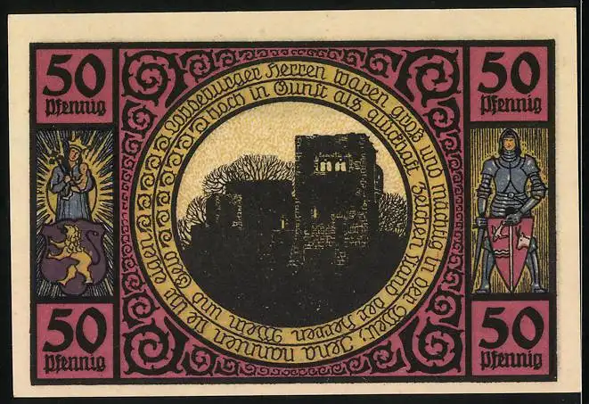 Notgeld Lobeda, 1921, 50 Pfennig, Stadtansicht und Ruine mit historischen Figuren