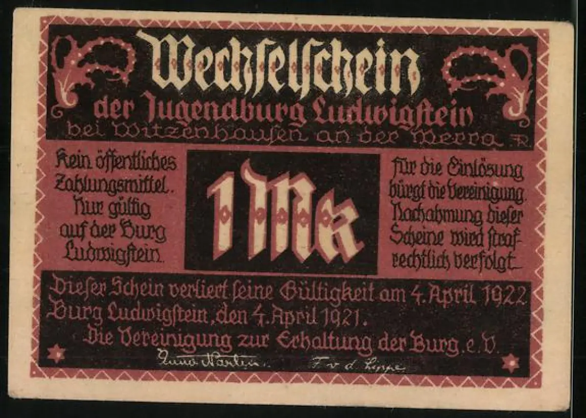 Notgeld Ludwigstein 1921, 1 Mark, Jugendburg mit Zitat und Wappen, Wechsel- und Gültigkeitshinweis