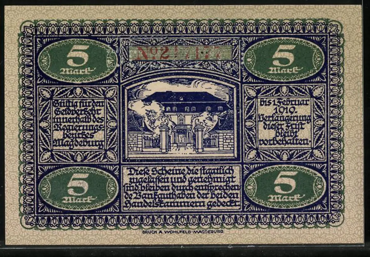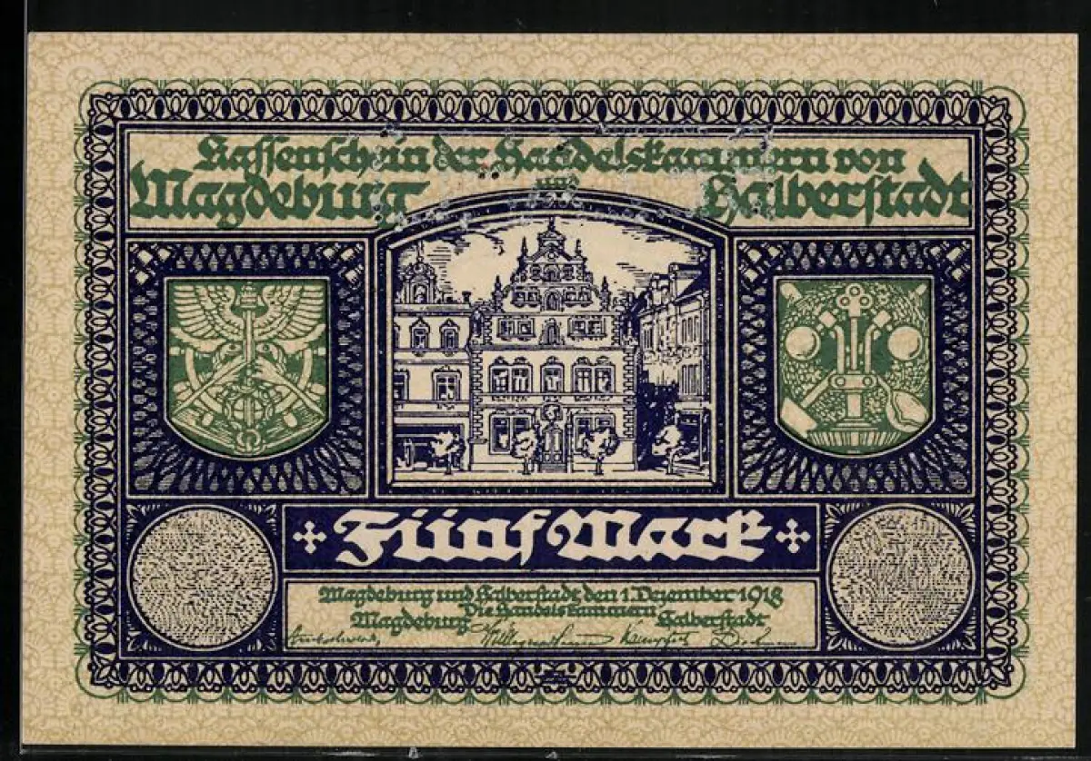 Notgeld Magdeburg & Halberstadt 1918, 5 Mark, Häuser und Wappen von Magdeburg und Halberstadt