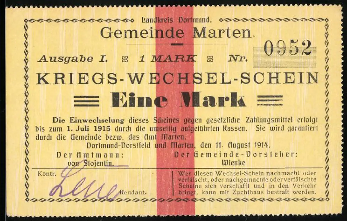 Notgeld Marten 1914, 1 Mark, Kriegs-Wechsel-Schein mit rot-schwarzem Text und Garantieerklärung