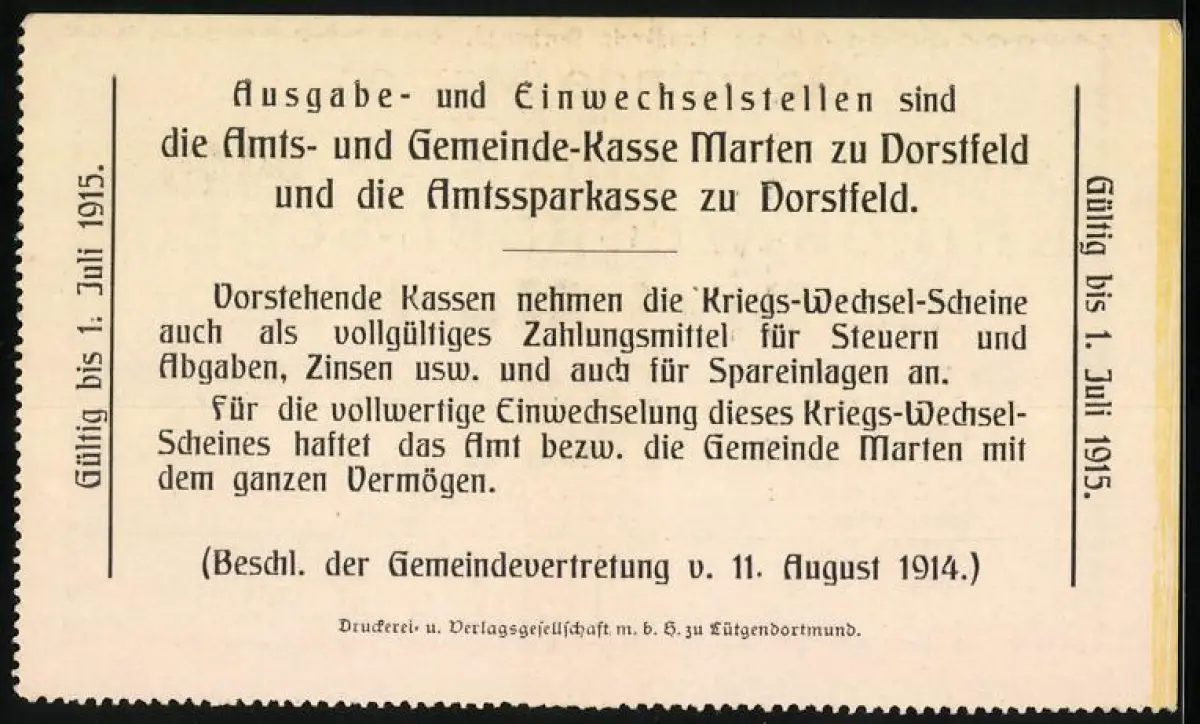 Notgeld Marten 1914, 3 Mark, Text über Einlösung und Gültigkeitsdatum