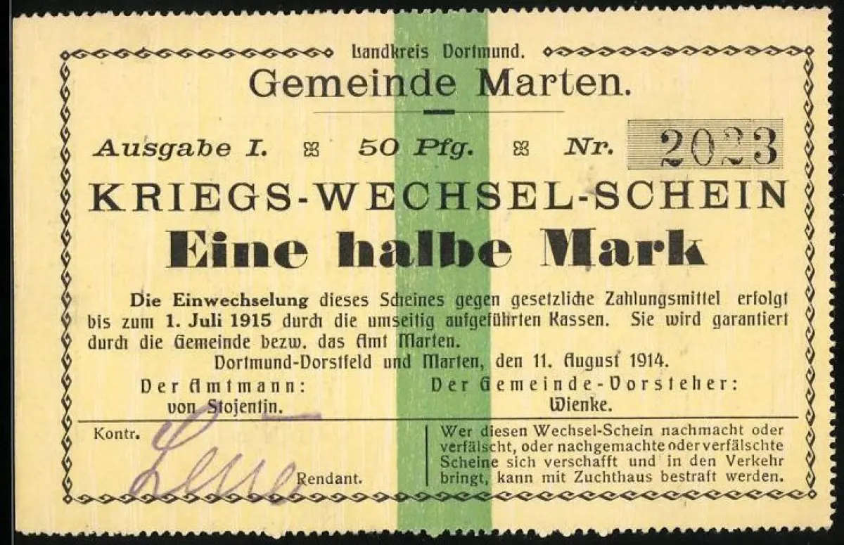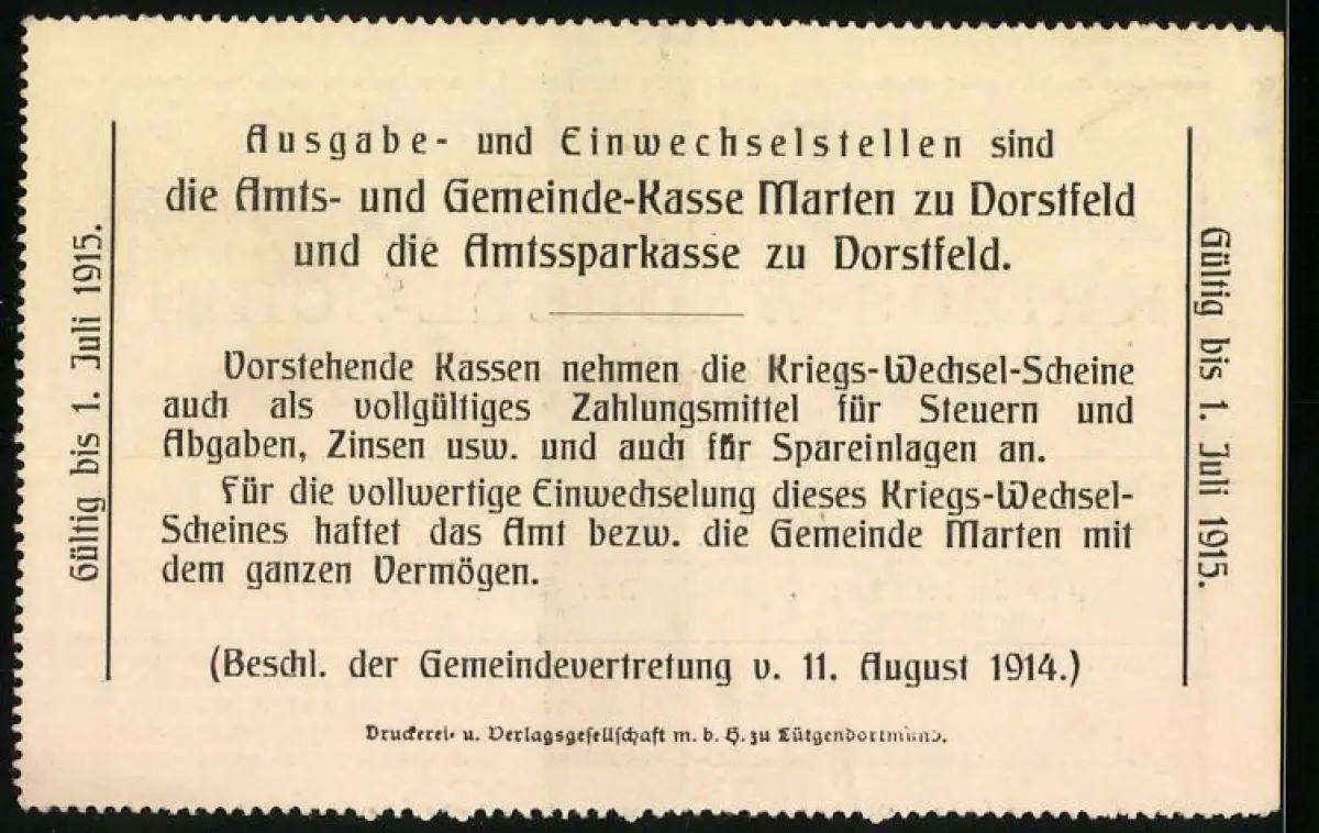Notgeld Marten 1914, 50 Pfennig, Text über Einlösung und Gültigkeit bis 1915