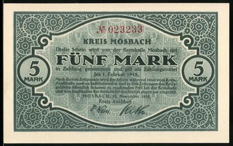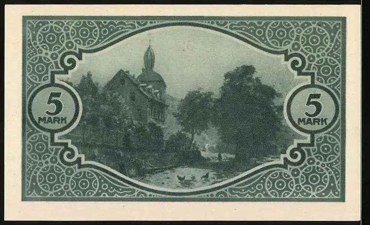 Notgeld Mosbach 1918, 5 Mark, Seriennummer 028233, Landschaftsszene mit Fluss und Kirche