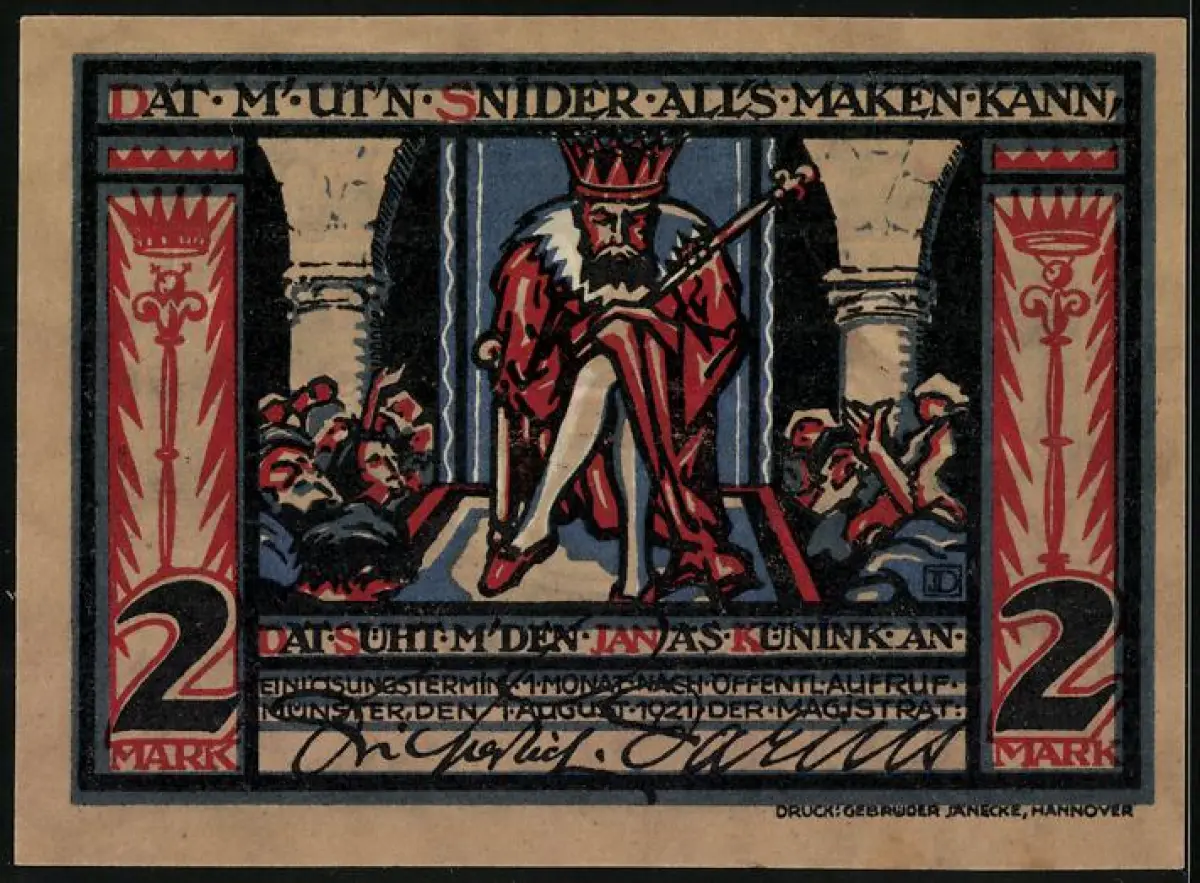 Notgeld Münster 1921, 2 Mark, gekrönter Globus und König mit Zepter