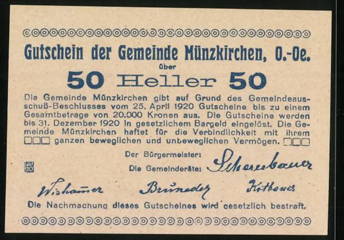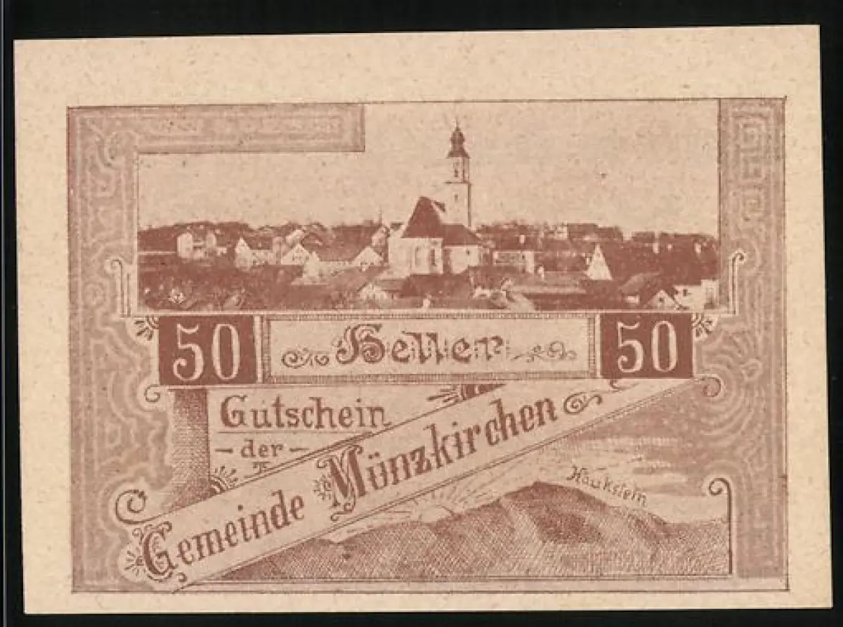 Notgeld Münzkirchen 1920, 50 Heller, Stadtansicht mit Kirche und Landschaft