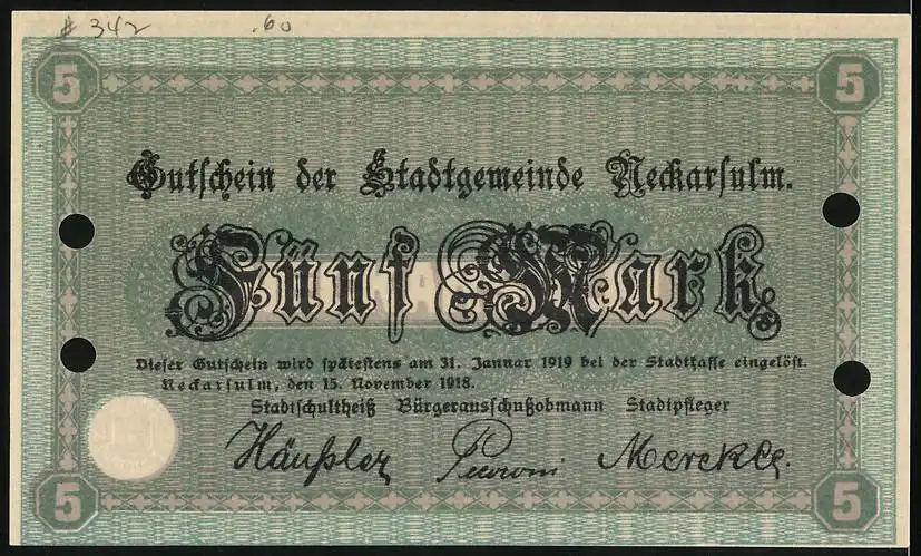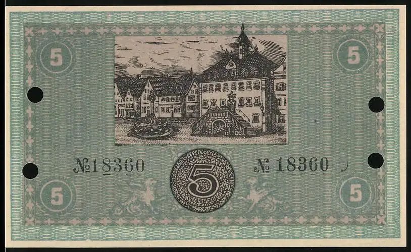 Notgeld Neckarsulm, 1918, 5 Mark, Gutschein der Stadtgemeinde, Gebäudeabbildung