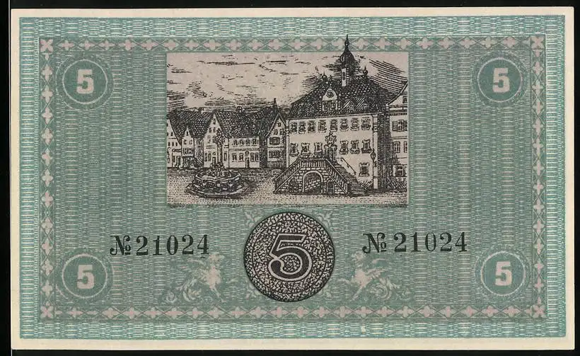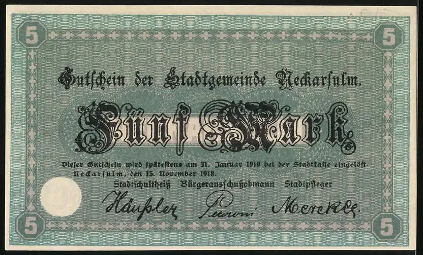 Notgeld Neckarsulm 1918, 5 Mark, Gutschein der Stadtgemeinde mit Stadtansicht und Unterschriften