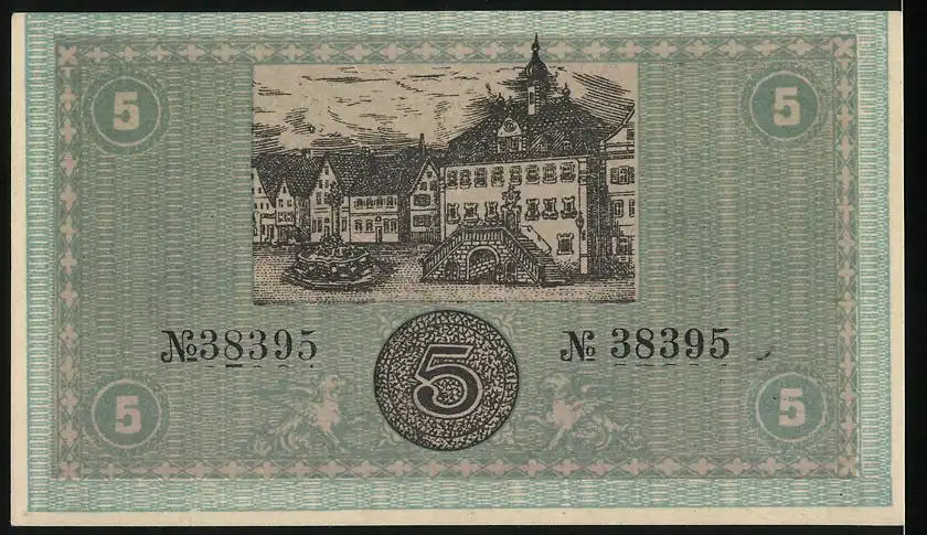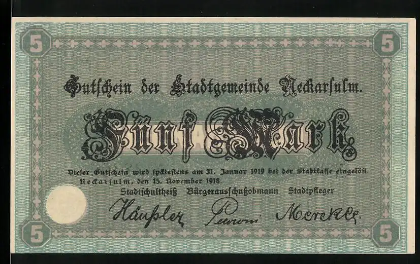 Notgeld Neckarsulm 1918, 5 Mark, Stadtgemeinde Gutschein mit Stadtansicht