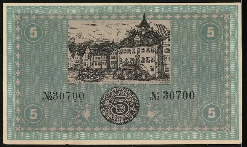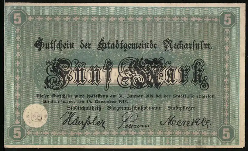 Notgeld Neckarsulm 1918, 5 Mark, grüne Note mit Rathausabbildung und Unterschriften