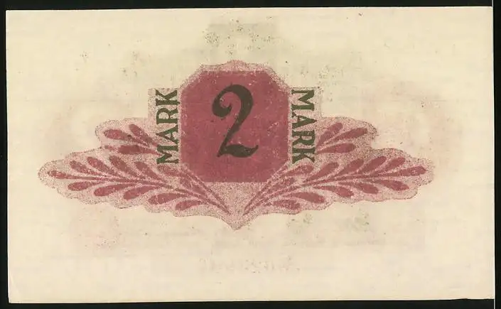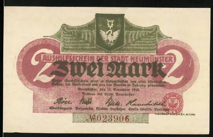 Notgeld Neumünster 1918, 2 Mark, Ausgabedatum 12. November 1918, Seriennummer 023906