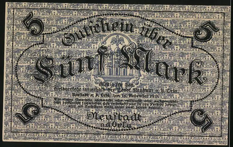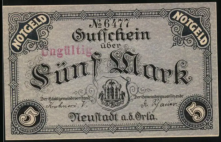 Notgeld Neustadt a.d. Orla, 1918, 5 Mark, Gutschein mit Stadtwappen und Verzierung