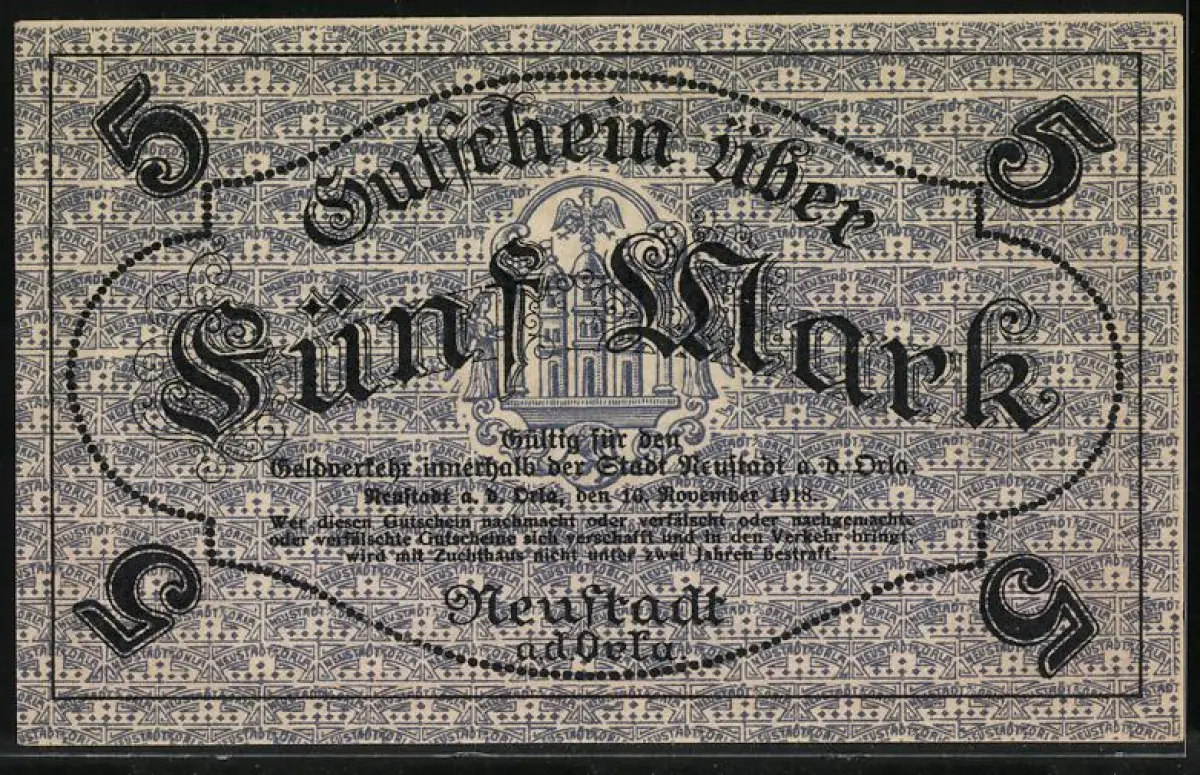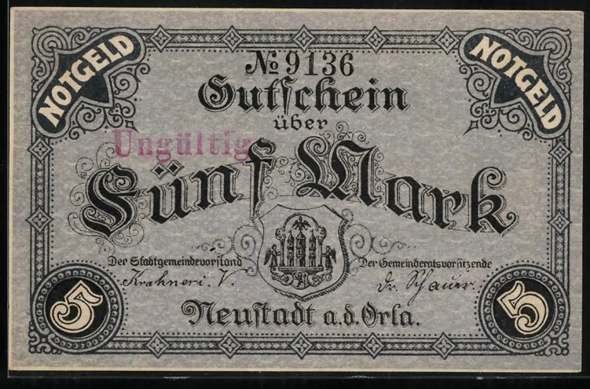 Notgeld Neustadt a.d. Orla 1918, 5 Mark, Stadtwappen und dekoratives Muster, Stempel: Ungültig