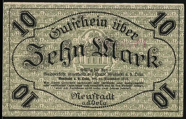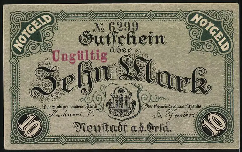 Notgeld Neustadt an der Orla, 1918, 10 Mark, Gültig innerhalb der Stadt, Seriennummer 6299, Stempel Ungültig