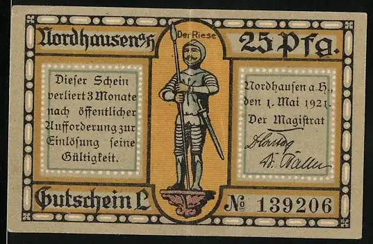 Notgeld Nordhausen, 1921, 25 Pfennig, Gutschein mit Der Riese und alter Stadtbefestigung am Primariusgraben