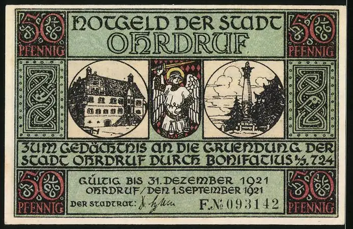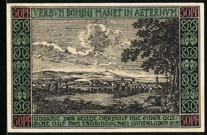 Notgeld Ohrdruf 1921, 50 Pfennig, Ortsansicht mit thüringischen Candelaber
