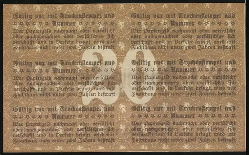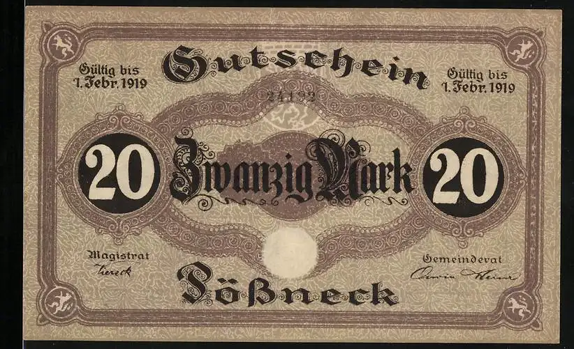 Notgeld Pössneck 1919, 20 Mark, Gutschein gültig bis 1. Febr. 1919