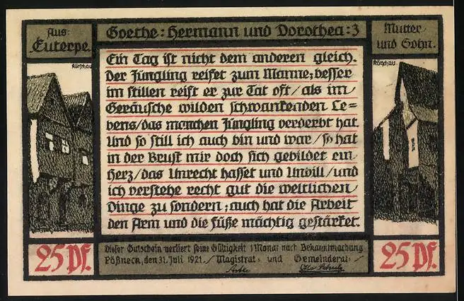 Notgeld Pössneck, 1921, 25 Pf, Mutter und Sohn, Goethe Hermann und Dorothea