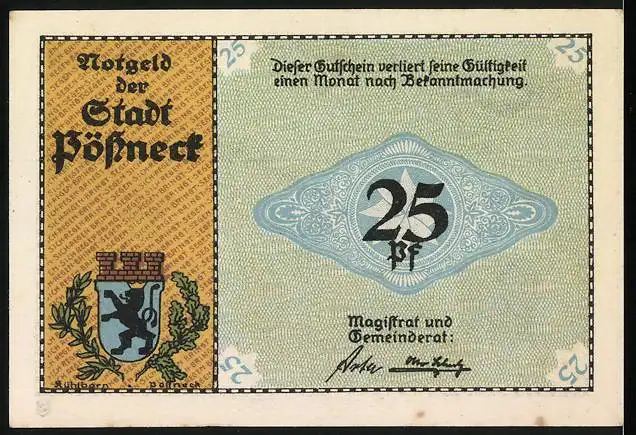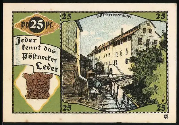 Notgeld Pössneck, 1921, 25 Pfennig, Alte Gerberhäuser und Stadtwappen, Text Jeder kennt das Pössnecker Leder