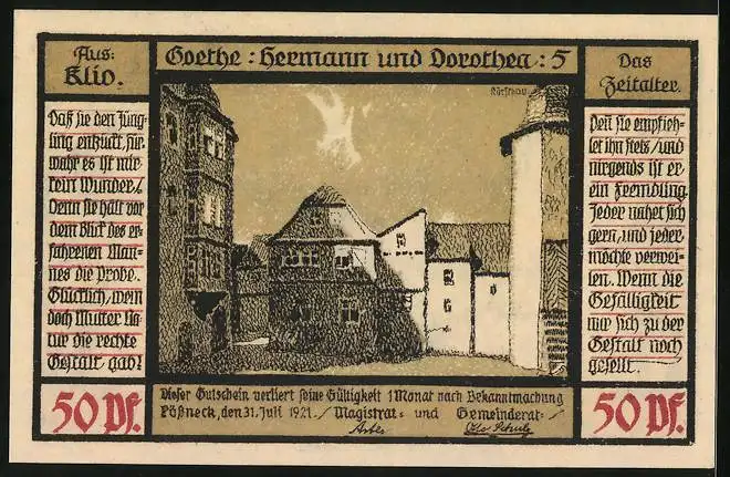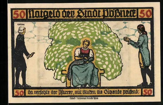 Notgeld Pössneck 1921, 50 Pfennig, Goethe: Hermann und Dorothea, Szene mit dem Pfarrer, Ortspartie