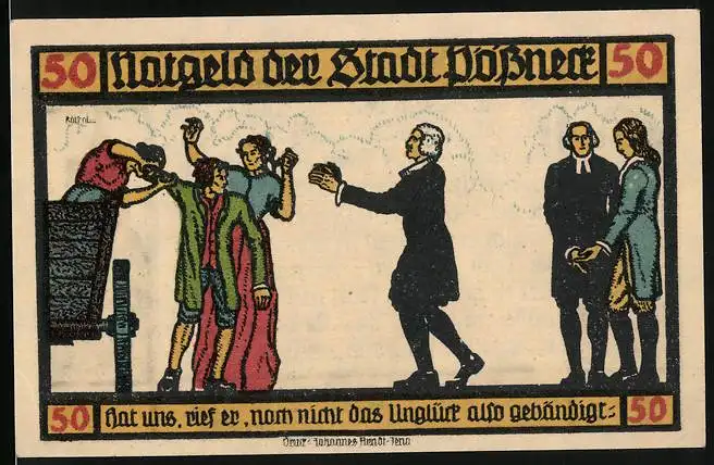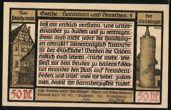 Notgeld Pössneck 1921, 50 Pfennig, Hat uns, rief er, noch nicht das Unglück also gebändigt, Goethe: Hermann u. Dorothea 4