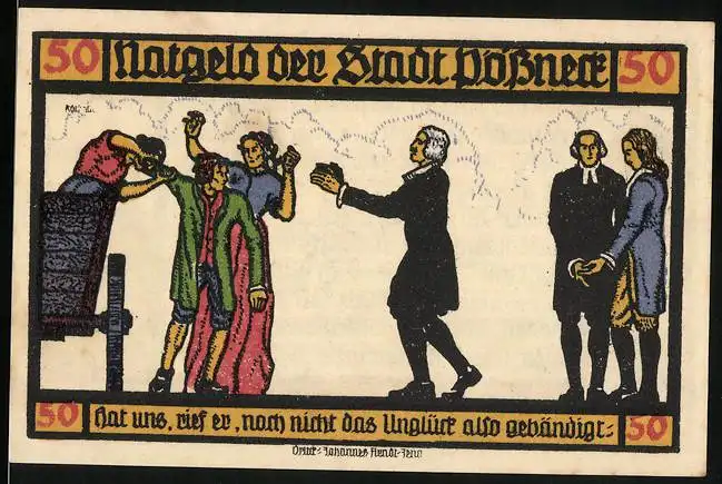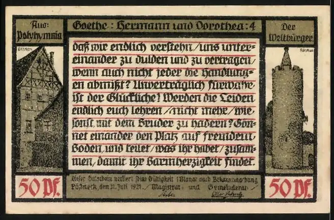 Notgeld Pössneck 1921, 50 Pfennig, Menschenmenge und Zitate von Goethe, Pössnecker Gebäude und Der Weltbürger Turm
